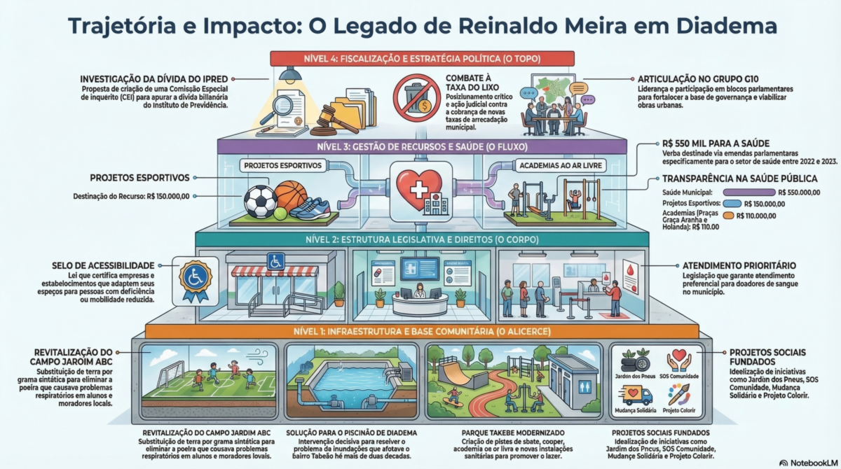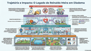 O vereador Reinaldo Antônio Meira, em seu segundo mandato na Câmara Municipal de Diadema, consolidou uma trajetória marcada por ações voltadas ao bem-estar da comunidade. Natural da cidade, Meira iniciou sua carreira política com projetos que revitalizaram espaços públicos e criaram alternativas de lazer, como a transformação do Campo Jardim ABC em 2015 e a reestruturação do Jardim Takebe, que passou a oferecer pistas de skate, cooper e academia ao ar livre.